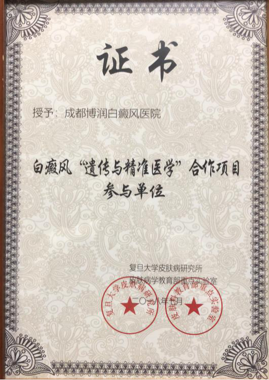其中,白癜风精准医学研究联盟成员,四川省白癜风规范化诊疗临床,成都博润白癜风医院持续进行白癜风精准医学研究,与四川省中医药信息学会色素专业委员会组建(白癜风临床实验研究)科研团队,就白癜风影像检测、大数据、药物、治疗技术等方面,实现临床科研的转化应用。